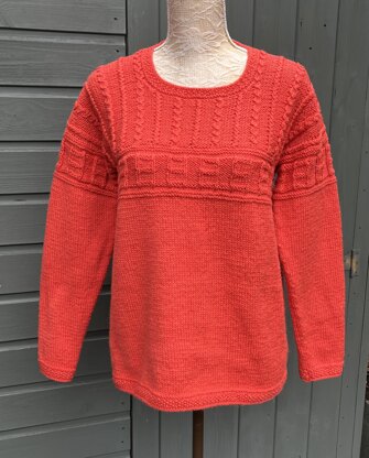 A charming design inspired by the ever-popular Gansey sweater, this piece offers beautiful texture without the need for cabling. Traditional “ladder” motifs are featured on the yoke and sleeve tops, while the upper yoke showcases a rope-effect pattern created using twisted stitches. These two striking stitch patterns are separated by garter stitch ridges, adding structure and visual interest to the overall design. The main body and sleeves are worked in classic stocking stitch, with moss stitch borders and a single ridge along each side to provide a clean, balanced finish. The main body is worked bottom up, and the sleeves are worked top down. Full written instructions are provided.