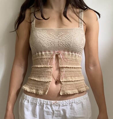 This elegant top will fall softly, embodying the spirit of a fairy garden with its whimsical motifs and airy construction. Perfect for layering on a warm summer day!