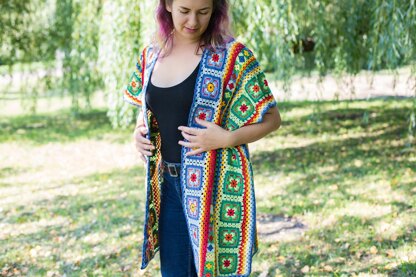 Colorful crochet cardigan pattern "GARDEN SQUARE" includes: