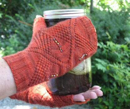 After creating my Garden Trellis Tam, of course, I had to make matching fingerless gloves. After finishing a garden trellis square, and laying it across my hand, I new exactly how I was going to construct my fingerless gloves. All I had to do was close the beginning and ending of the square, leaving an opening for the thumb; and, pick up stitches at the top and the bottom to finish the finger ribbing and the cuff ribbing. Very easy. It just hugs your hand in all the right places. Again, the beads were added for a little sparkle, but are optional.