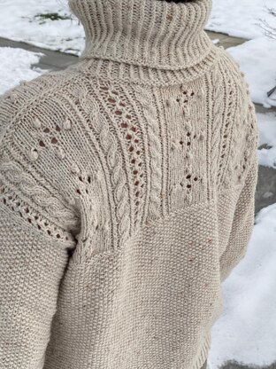 The sweater is worked bottom up, starting with a seed stitch section, followed by a shoulder yoke pattern representing flowers and growing plants (cables and eyelet stripes). The sleeves are worked top down. The sweater has a positive ease of 15-20cm/6-8in.
