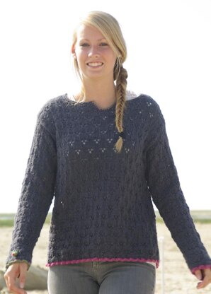 Anleitung mit Schnitt und Strickschrift. Man benötigt zwischen 11 und 14 Knäuel in Dunkelgrau und je 1 Knäuel in Grün und Pink. Wer mag näht als Verzierung an einen Ärmel eine kleine gefilzte Blüte. Ausschnitt mit kurzem Schlitz wird behäkelt.