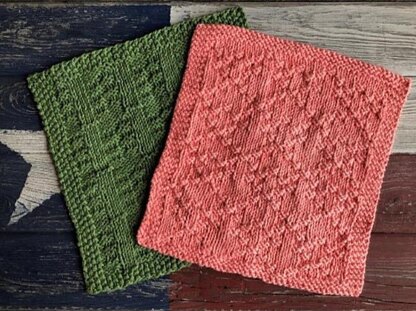 Both are knitted flat. These instructions produce a tighter, more durable fabric. Both cloths have written instructions and charts. As with most Texas Knit 'Em patterns, these two dishcloths are named for two towns in Texas. The City of Garland is part of the Dallas-Fort Worth Metroplex, and Cactus is a small town in the Texas Panhandle.