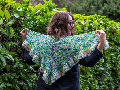 When we decided to carry Araucania’s kettle dyed lace weight cashmere, Trauco, all I could think of was a soft shawl wrapped around my neck. I wanted something simple, but with a wee bit of pizzazz. I futzed around a bit with the basic neck-down garter shawl idea, and came up with this. A cashmere garter hug o’ goodness. Yummmmm.