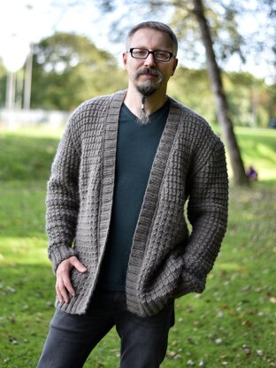 Gear Cardigan is a quick and easy project for those who love knitting with large needles. It is knitted bottom up with the bulky weight yarn. Back, front and sleeves are knitted separately. After all parts are sewn together stitches picked up along the front for neck finishing.