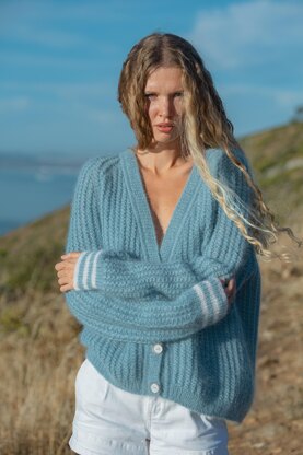 Geek Chic Cardigan is knit in 1 piece, top-down seamlessly. First work the raglan yoke and main body flat, then both sleeves in the round. Finish by working applied button bands and collar (in 1 piece) sideways. Main fabric of the cardigan is worked in all-over rib-based texture (modification on bamboo stitch), trimmings - in regular 1x1 rib.