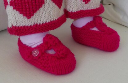 These cute T-bar style baby shoes are knitted in garter stitch and stocking stitch and have a buttoned strap.