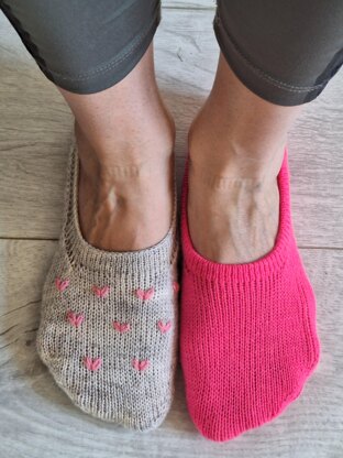 DESIGN OVERVIEW: This stylish pair of slippers is knitted in stockinette seamlessly and decorated with tiny embroidered hearts. They can be worked on either DPNs or using the magic loop method for the toe section.