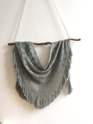 Geometrical triangles in a topdown shawl crochet pattern, forming a lovely contrast with the fringed edging.