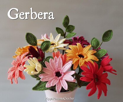 This is a crochet pattern. The Instructions are in American Standard Terms and include: Easy to follow Step-by-step instructions and detailed photo guide with 100 + high resolution images that will explain each step on how to crochet and assemble every part of this Gerbera Flower, Buds, Leaves and decorative leaf stick.