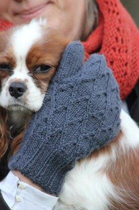 Skills needed: casting on, knitting, purling, working twisted stitches, decreasing, working in afterthought thumb (instructions given). Gauge: 20 sts/28 rows over 4 in/10 cm on larger needles in stockinette.