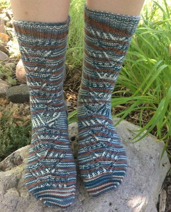 The stitch pattern uses lace to keep them stretchy, but the eyelets can also be closed up by working them through the back loop to make the socks more “masculine”.
