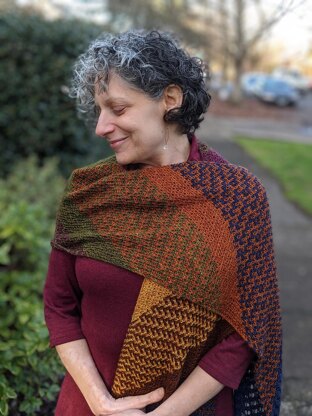 The Gibbous Wrap is a bias-knit garter-stitch-based wrap with crescent moons at the edges and colorwork slip-stitch body, featuring a flow of color play. Suitable for a gradient set and solid color, or have fun stash diving! Choose any five contrast colors and one main color that play well together.