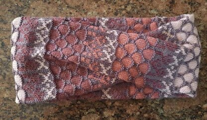 Gift of Honey Cowl. This moebius style cowl is started with a provisional cast on and worked in a tube with slipped stitches forming the ‘colour work’ over two 16 stitch repeat patterns and then given a 180 twist before the joining the 2 ends with either the Kitchener stitch or three needle bind off method. Due to using slipped stitches for the patterning you will only ever be knitting with one colour at a time and slipping stitches along with the odd purl row. I have chosen to go with a neutral base for the Main colour (MC) paired with a high contrast colour (CC1) and accompanied by two complimentary colours to form my colour scheme, but you can choose to work with as many colours as you wish to when you are planning how your colours will play together.