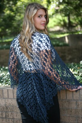 I have stitched this in 3 yarns to show its versatility. Depending on yarn and edging used, this shawl can be dainty, casual or a little bit avant-garde.