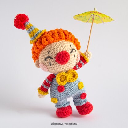 The pattern is written in U.S. terminology. The main part of this project is worked in rounds so you might want to use a stitch marker to mark the end of each round. There is no specific gauge for this project, just try to keep it tight and even throughout each piece. Giggles the Clown is worked with Hobbii Rainbow Cotton 8/6 but any similar Sport or DK weight cotton yarn will work similarly.