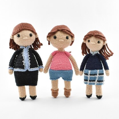 FINISHED SIZE: If crocheted with a 2.5mm hook and DK yarn, the finished Lorelai and Emily dolls should measure around 8in and the finished Rory doll should measure 7.5in.