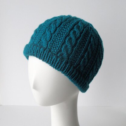 Cabled hat with beautiful crown and two options for the brim - standard rib or cuffed rib.