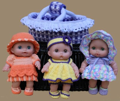 Gingham Tote Tykes, #411. This set will make a wonderful gift set. Make the Gingham Tote Bassinet and then make the three darling outfits for your dolls and place in tote. Pattern fits an 8 1/2" chubby baby doll...shown on Berenguer Lil' Cutesies doll. Made from sport weight or baby yarn, with one of the outfits trimmed in size 10 crochet thread