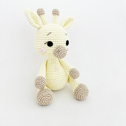 The giraffe measures approximately 20 cm in a seated position when using the materials mentioned above. If you are using yarn with a different gauge the toy’s measurements will change. Feel free to use any yarn you want, the toy itself won’t change, just the size. Make sure you sew tightly every part of the toy.