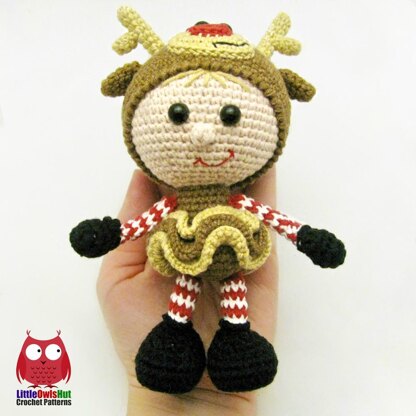 - Four black beads or half beads for the eyes (I used 7 mm in diameter) for the eyes of the doll and the eyes of the reindeer. Alternatively you can embroider or crochet them instead – in which case you will need a small amount of black color yarn.
