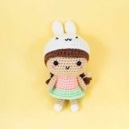 | One size only: | Using fingering yarn with 2.5mm hook will produce a doll of about 11.5cm/4.5in tall (sitting down & including bunny ears) and 6cm/2.3in wide. |