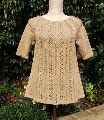 This gorgeous top is not only elegant but also comfortable to wear with the ladder and lace patterning. The short raglan sleeves sit just above the elbow and the neat-fitting wide rib yoke gives a stylish, flattering finish.
