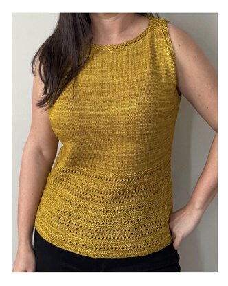 Top is knit from the bottom up. First, you’ll cast on sts and work the lace part in the round. The work is then divided, and the front and back stockinette portions are worked flat then seamed at the sides and shoulders.