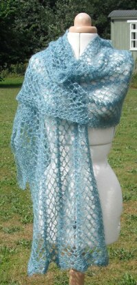 I am a huge fan of kidsilk yarn, so I was overjoyed when the new Kidsilk Haze Glamour yarn was produced. The addition of sequins makes this something really special. So I bought 4 balls in a teal blue (my favourite colour) and designed a lovely wrap. Although designed for Rowan Kidsilk Haze Glamour, any kidsilk yarn can be used. The finished size is 45 cm (18in) wide by 200 cm (approx. 80 in) long when blocked. Written in English and US crochet terms, and charted. I used 4 balls of Kidilk Haze Glamour.
