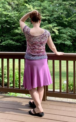 My favorite summer top! I had so much fun creating this "melted" version, but I've got plans for a bunch of different versions- stripes, using some bright kettle dyed yarns, oh the possibilities are endless with this one. The good news is that it knits up super fast (I designed and knit this one in a weekend!), so you'll be able to make all the tops of your dreams with this one pattern. It's a completely seamless knit (you start by casting on the neckband and are knitting in the round from the first stitch!), the fun lace detail over the back is worked within a set panel, so you don't even have to worry about working in increase stitches that might mess up the lace pattern and you could absolutely leave it out if you just wanted some straight knitting so you can enjoy catching up on your favorite show......not that I would know anything about doing that ;)
