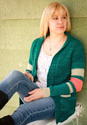 This letterman’s sweater-inspired cardigan is a sweater chest staple you’ll be living in year-round. Stripes shine when worked in reverse stockinette—extra blips of color pop through at the transitions, so they really stand out! An open front, modest shawl collar, handy pockets, and pops of contrast trim take a simple top-down raglan up a notch. Added length makes it extra cozy, but a deep V neck and moderate waist shaping give this boyfriend-style sweater a feminine touch.