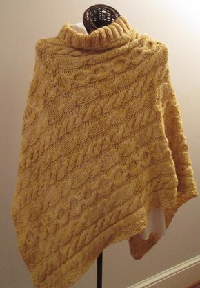 Rich in texture, rich in fibre, and rich in warmth... this poncho is a very gratifying knit that works up quickly despite the overall cable design... the lusciously soft BFL Aran weight is good for stitch design while working up quickly..,, warm, snuggly, luscious to wear... a delight to know and a delight to wear!