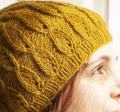This beanie is called Golden Mustard because the yarn shade ‘Daunder’ immediately reminded me of mustard. I designed a cable with an open leafy motif for this beanie.