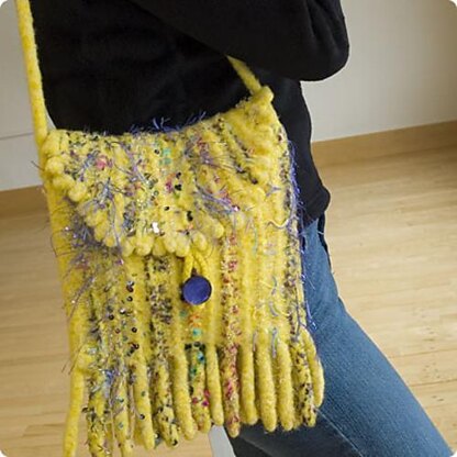 Start with a basic felting wool and add whatever extras you want. The curly fingers at the bottom turn into tresses when felted. The bag is knit sideways in one piece with just one side seam.