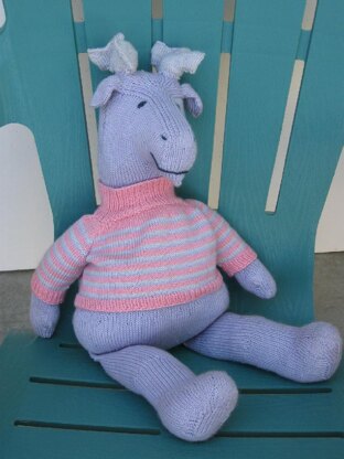 The moose and its sweater are knit in the round on DP needles using short rows for shaping. The arms are knit separately and sewn on. The ears and antlers are knit as part of the head. There are 2 variations for the sweater - striped or a snowflake design (chart for the snowflake design is included).