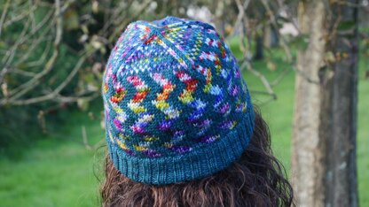 This hat features a simple and easily memorable stranded colourwork design, elevated by colour-changing yarn. The double thickness brim requires no sewing. This design was inspired by the Goosebumps yarn collection by Yarnworthy.