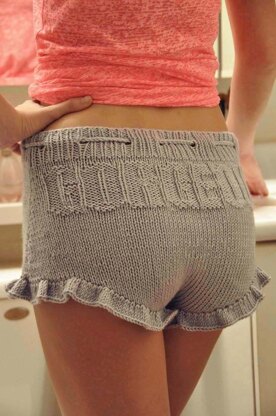 This pattern includes a blank chart so that you can customize your word/design on the back, a link to a video by me showing you how to pick up stitches for the ruffle, as well as notes for knitting these shorties in the round to save you time on finishing!