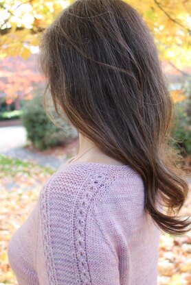 Gortenzia pullover is worked top-down in rounds, completely seamlessly, starting with the neckband. The seamless saddle-shoulder construction in this design is combined with contiguous construction to shape the yoke and the sleeve caps. The body of the sweater is worked with an A-line shaping up to the bottom hemline. At the beginning of the hemline the stitches are separated for front and back, and each part is worked separately back and forth. The sleeves are worked top-down in rounds to desired length and finished with cuffs in a matching to hemline pattern.
