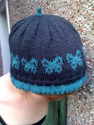This hat combines the softness of butterflies knitted in flecked tweed wool, with a hint of dark gothic style. It’s pleated at the top, and is finished with a small bobble and a picot edging. The butterflies can be decorated with beaded detail, or left plain as shown here.