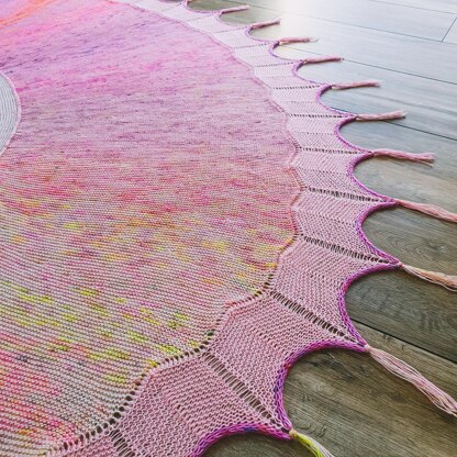 large version with fringes: 509g, 1.864m 2,038yds colors: the minis are dyed in “Mohairino Medley” gradient, the MC is “Baby Pink” colorway.