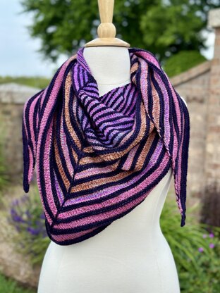 This shawl is knit from the top down with contrasting stripes alternating garter and stockinette stitch. Increases in every row create a broad but relatively shallow triangle, making this a great wrap to wear in a variety of ways.