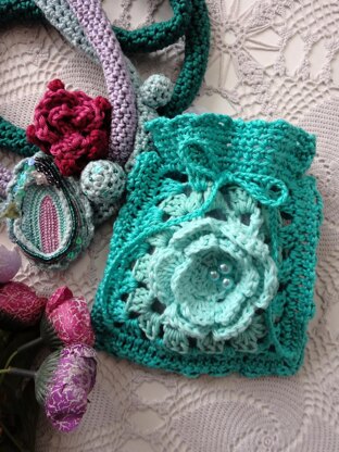 Yarn and hook: Sport yarn of your choice (I love working with Tango and Phil Cotton 3) and a 3 mm hook (UK 11/ US D). The best effect is achieved by using 3 colors /shades of the same color. Mind that you can use whatever yarn size/weight (and relevant hook for that weight) you have at hand; that will only influence the size of your pouch – hence smaller weights of yarn will yield smaller pouches, heavier weights will produce big/large pouches. Other: Tapestry needle for weaving ends. Optional: sewing needle and thread and pearl beads if you want to decorate your flower. A sheer organza bag if you want it lined. Stitches in American terminology: chain (ch), chain space (ch-sp), stitch (st.), slip stitch (sl st), single crochet (sc), half double crochet (hdc), double crochet (dc). Measurement of pouch: 14.5 x 16 cm (5.51” x 6.29”)