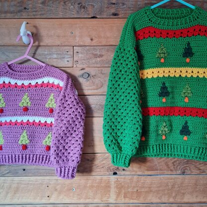 Show some holiday cheer this winter with the Granny Spruce Sweater. Cute bobbles and retro granny stripes combine to make a super snazzy and fantastically festive sweater, perfect for any seasonal event. Whether bubbling with excitement on Christmas Eve, or cosying up with a blanket and The Muppets, your small person will feel merry and bright in their new one-of-a-kind jumper. The pattern is graded for ages 1-2 years to 9-10 years. You can choose between two sleeve options and two back panel options. This pattern uses DK yarn and a 4mm hook. Size / finished circumference / approx. MC meterage 1-2y / 70 cm / 400 m 3-4y / 74 cm / 525 m 5-6y / 78 cm / 590 m 7-8y / 82 cm / 720 m 9-10y / 90 cm / 820 m