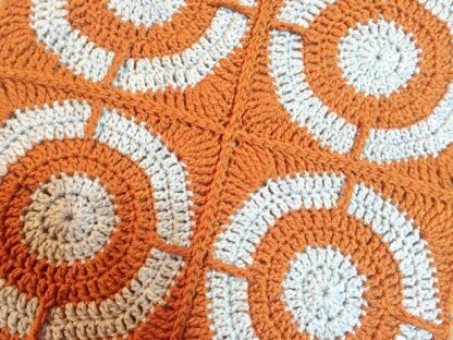 Easy beginner pattern with striking results. Simple bullseye circles with a twist - one single post stitch makes all the difference. A careful and minimalist join brings out the corner design, making for a modern and eye-catching throw.