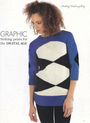 This is a pattern for a Graphic Jumper, originally published in Knitting magazine. I don t have the publication date but it will be the months following Dec 2013. It has an intarsia design on the front and sleeves, and a plain back, with rib edges. Photo Laurel Guilfoyle for Knitting magazine.