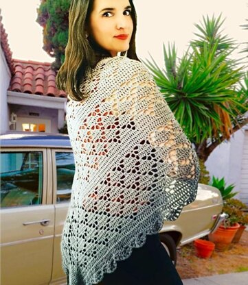 A pretty and feminine filet triangular crochet shawl that works up quickly, using beginner stitches (Ch, HDC, DC, SC, Sl St), to construct the delicate triangle lace motif and solid repeats. Finish with one of the border options, or with a delicate yarn fringe.