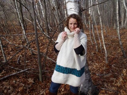 This oversized Grecian Poncho is worked from the bottom to the top, first in the rounds, later flat, with garter stitch at the arm opening sides. The shoulders are joined by Kitchener stitch. The stitches for the collar are picked along the neck edge and worked in 1x1 ribbing. Finished Poncho Size: For sizes S - M (L –XL, 2X – 3X) Length 30” / 77 cm (30” / 77 cm, 30” / 77 cm)