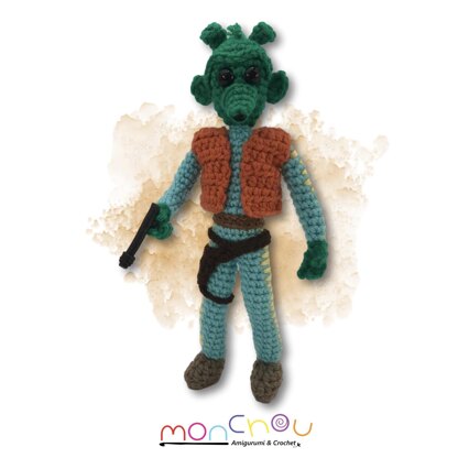 Made in worsted weight yarns, this under-achieving bounty hunter also has wired limbs and a polymer clay blaster (which sadly aren’t enough to change his fate).