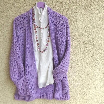 Crochet this feminine cardigan, it is a favorite addition to your wardrobe in this luscious lavender cotton yarn. Be comfortable and stylish foe any occasion.