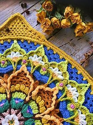 Description: a decorative, richly textured, floral-themed Mandala Block. Can be made as a cushion cover, a wall hanging, a centrepiece for a blanket, or a tote bag. There is an extension to this Block to upzise it to a Throw. Green Tea is the fourth and final block in a series of 4 x Blocks and 4 x Extensions ( to a 1.20m x 1.2m Throw size ).